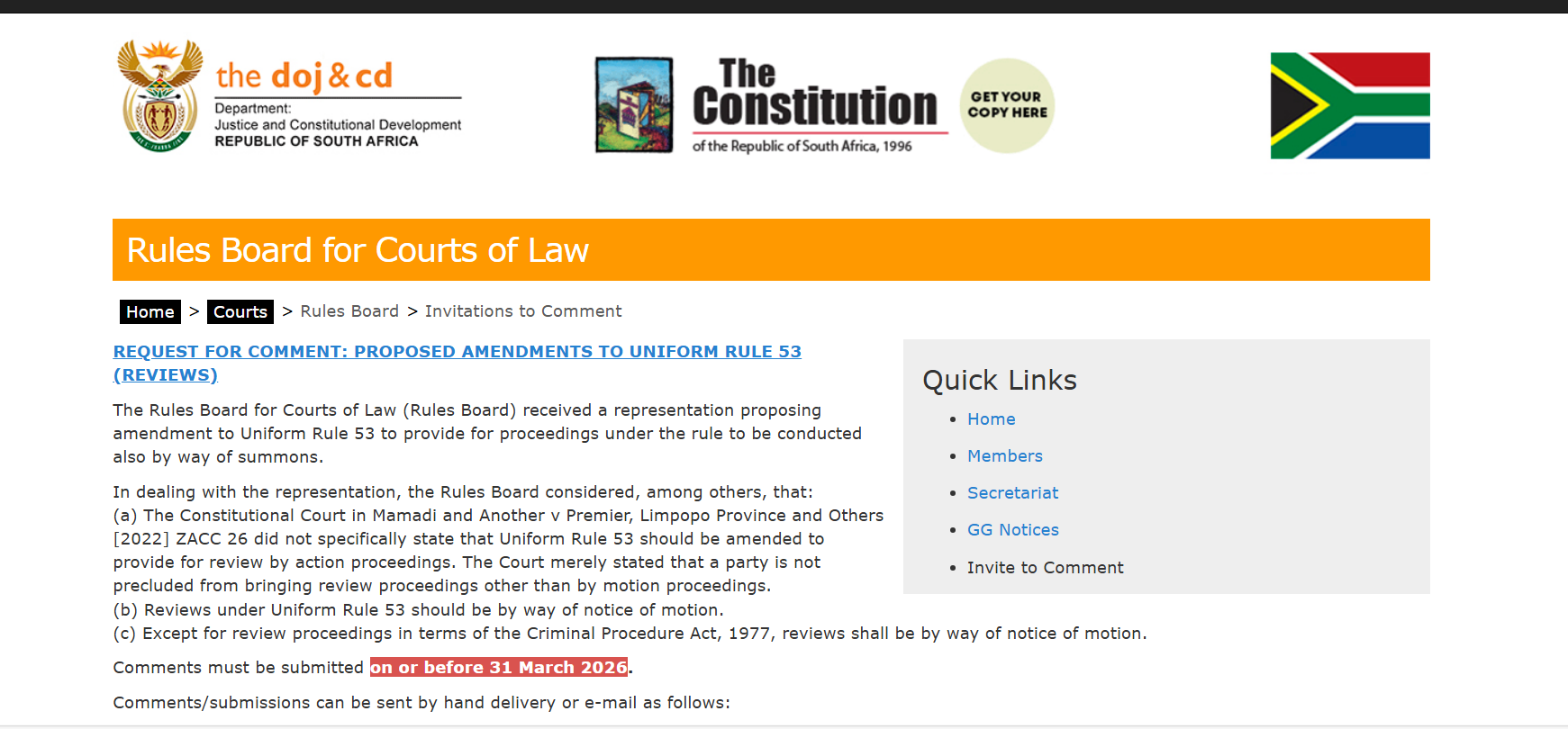 On behalf of the Rules Board for Courts of Law, the Department of Justice & Constitutional Development has issued a notice calling for input by 31 March 2026 on draft amendments to Uniform Rule 53.