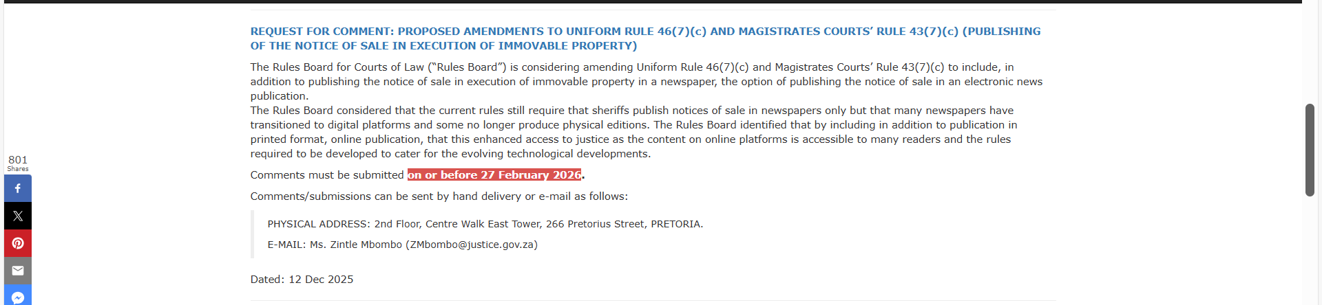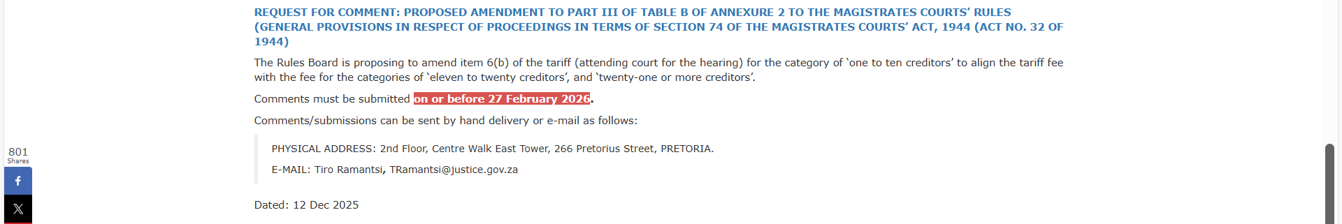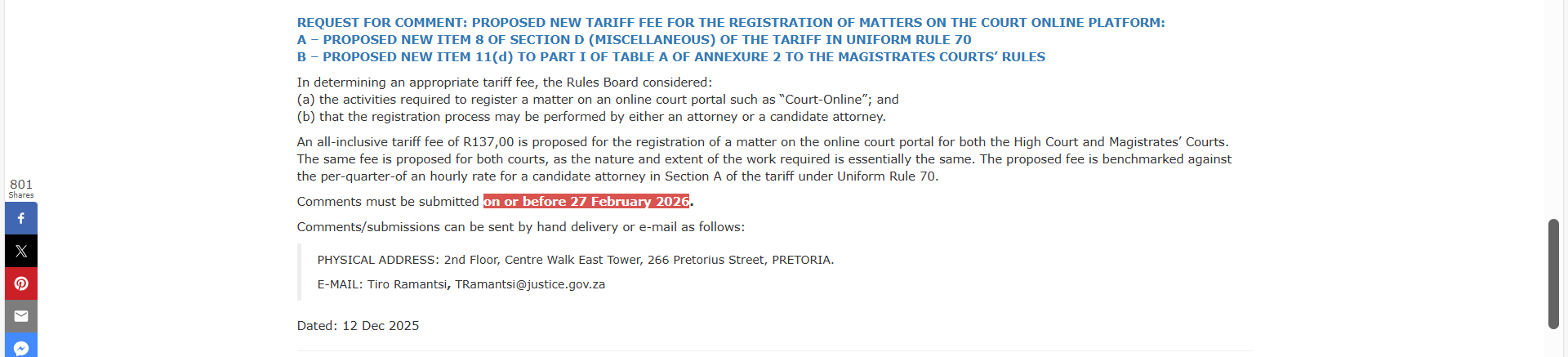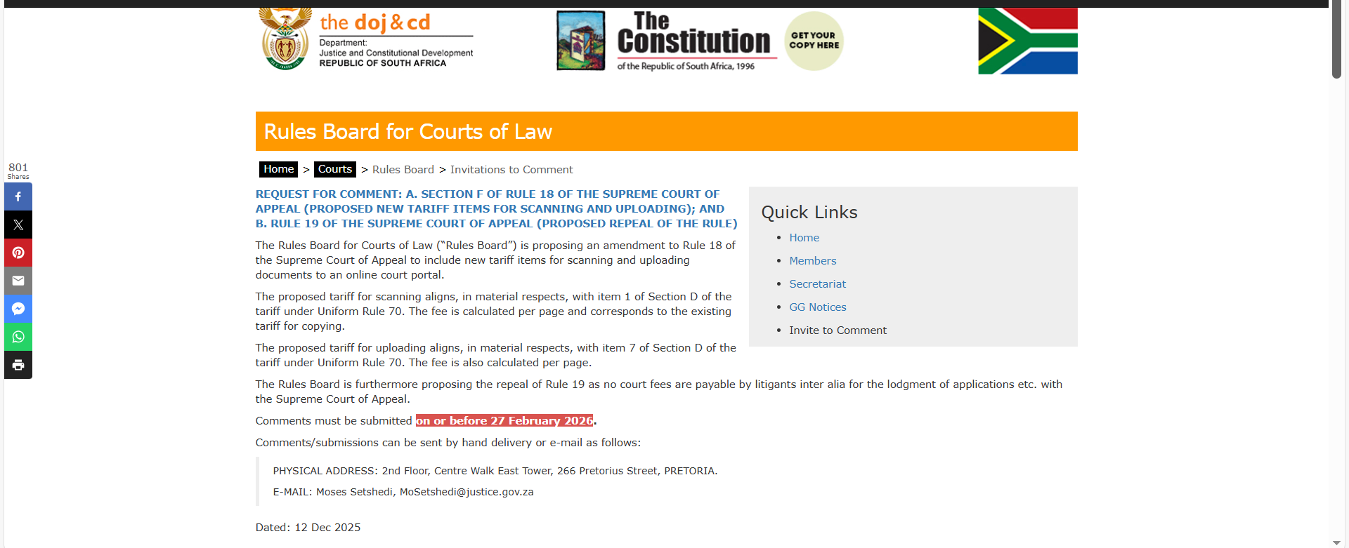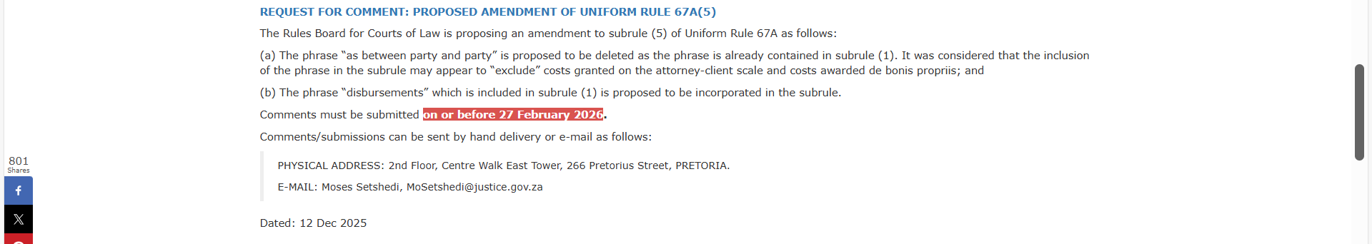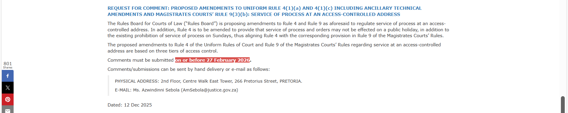 On behalf of the Rules Board for Courts of Law, the Department of Justice & Constitutional Development has released six draft amendments to rules affecting court proceedings – calling for public comments by 27 February 2026.
